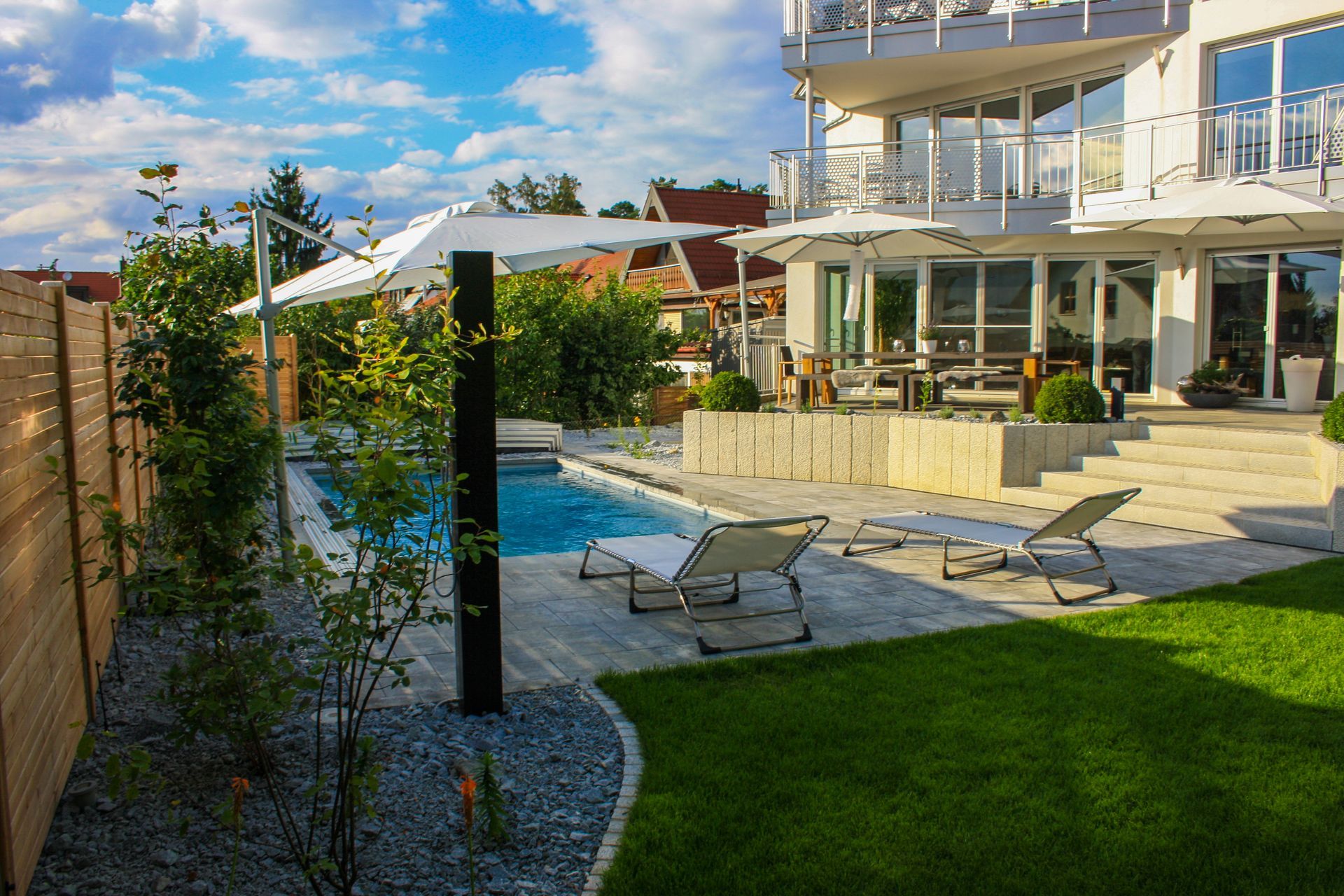 Der ursprüngliche "wilde" Hanggarten wich, wurde höhentechnisch ausgeglichen und bekam ein komplett neues Gesicht. Die Terrasse, die Treppenanlage und der Pool stehen nun im Mittelpunkt des Außenbereichs.