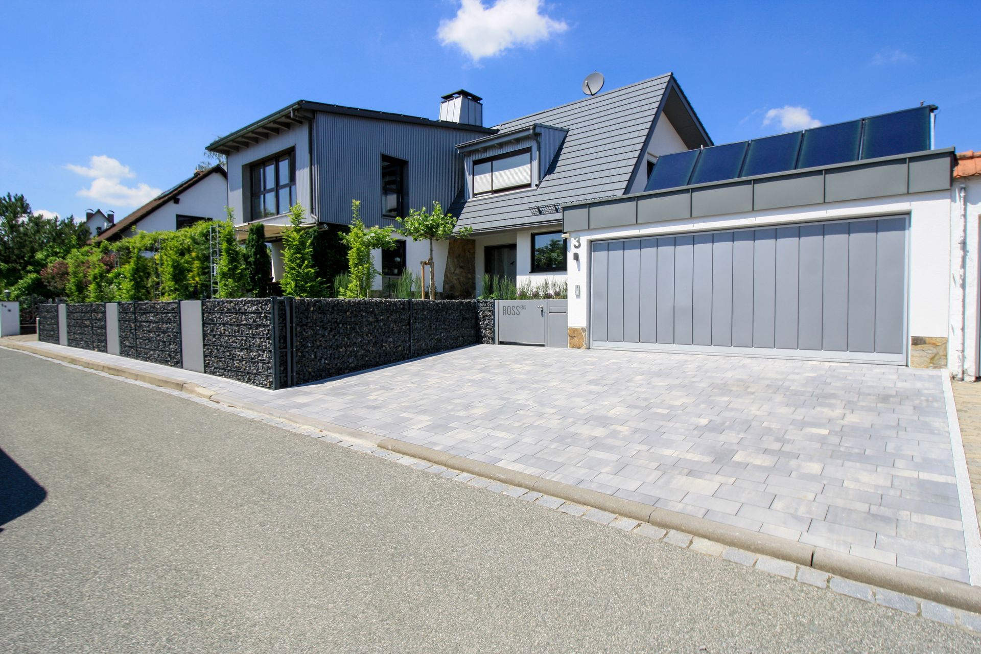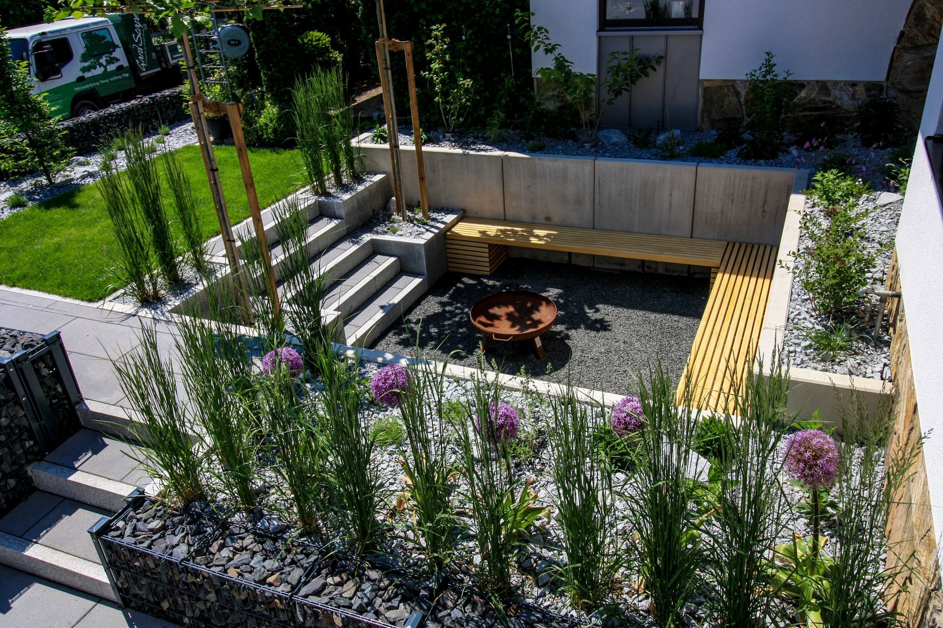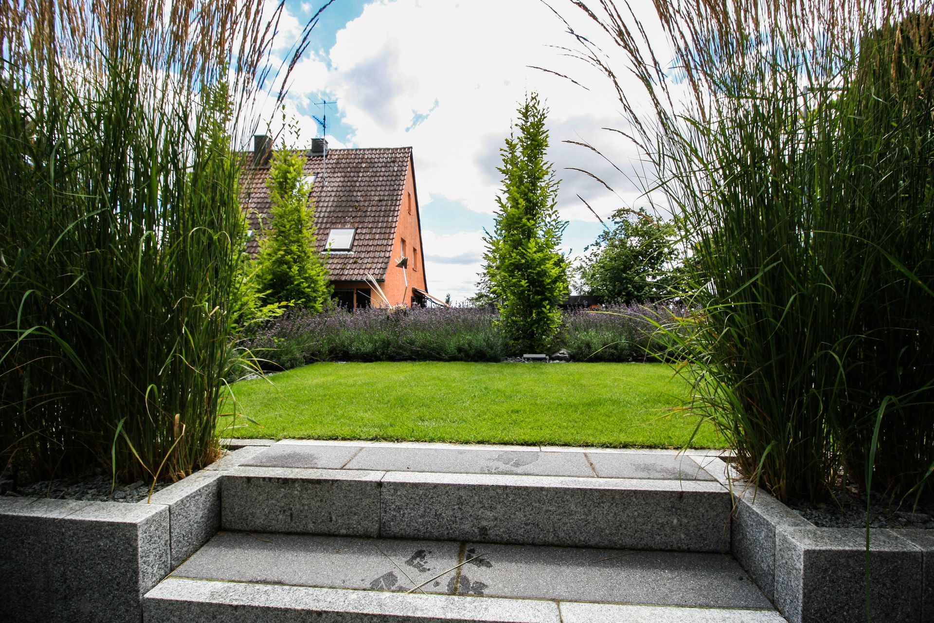 Die Senkterrasse wurde punktuell mit Reitgras bepflanzt um eine gewisse Privatsphäre zu schaffen und vor neugierigen Blicken zu schützen. Um die Geradlinigkeit der Gestaltung pflanzlich zu unterstreichen, wurden sieben Säulenhainbuchen an der Grundstücksgrenze gepflanzt. Diese sollen den Garten von außen hervorheben, stellen nach einigen Jahren einen Sichtschutz dar (auch für den ersten Stock) und bieten Vögeln im Sommer einen Nistplatz. Um eine Verbindung zwischen den Hainbuchen zu schaffen, wurden zusätzlich ca. 200 Lavendel gepflanzt. Dieses lange Lavendelfeld rahmt den Garten gekonnt ein und bringt eine gewisse Ruhe mit sich. Im Sommer blüht und duftet es ganz besonders und auch Bienen und Hummeln freuen sich über das große Nahrungsangebot.