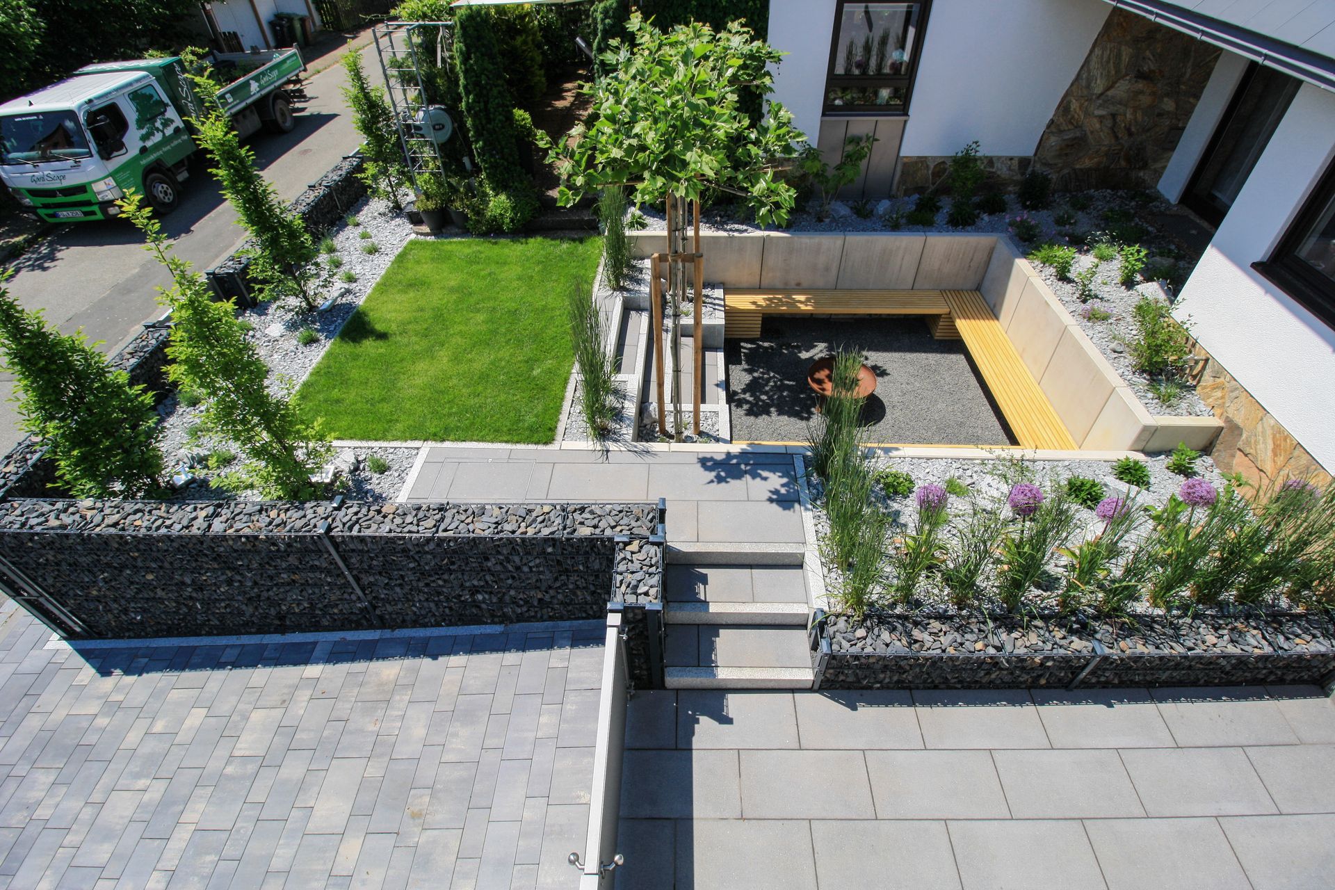 Die entstandenen Pflanzbeete um die Senkterrasse wurden mit einer Vielzahl an Zwergsträuchern und Stauden bepflanzt. Dabei wurden Wuchshöhen und /-formen, Blütenfarben und /-zeitpunkte genau aufeinander abgestimmt. Die Beete begeistern dadurch farbenfroh über Monate und aus jeder Perspektive.