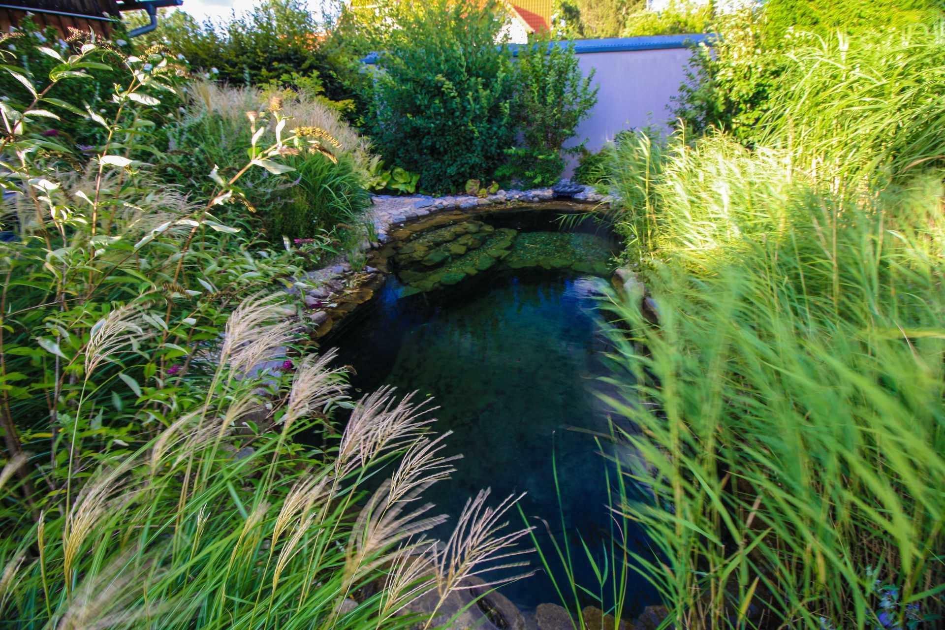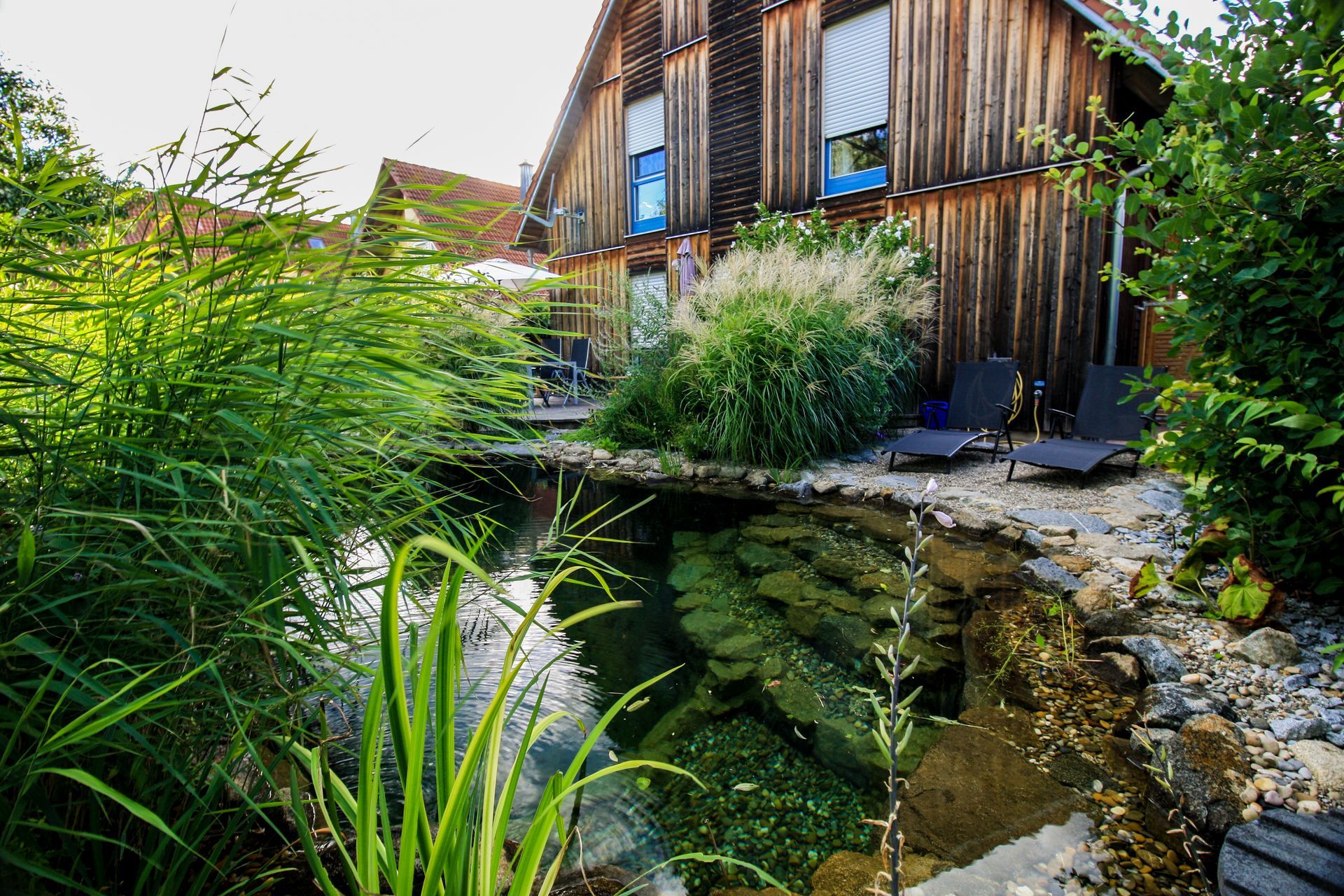 Harmonisch fügt sich der natürliche Schwimmteich in die Umgebung des Holzhauses ein. Bewusst wurden vor den Teich höhere Gräser und Sträucher mit kleinen Nischen gepflanzt, um einen direkten Einblick der Nachbarhäuser zu verhindern. Somit ist auch ein ungestörtes Schwimmen möglich und durch die Nischen hat man trotzdem einen freien Blick in den Garten. Die Bepflanzung entlang des Teiches bietet Blütenfreude und Insektennahrung von Frühjahr bis in den Spätherbst.