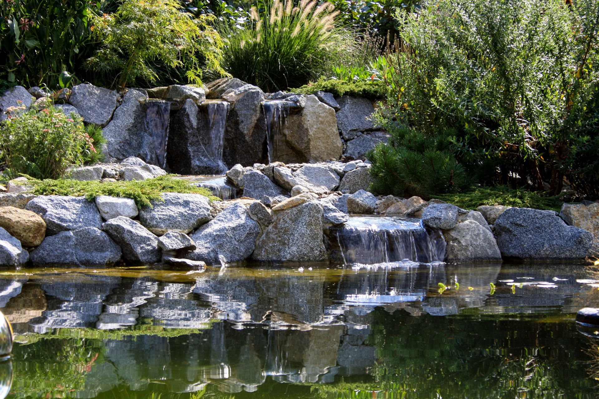 Das sanfte Plätschern des Bachlaufs ist Balsam für Augen und Ohren. In dem funkelnden Wasservorhang der kleinen Wasserfällen brechen sich die Strahlen der Sonne. Zarte Libellen in feurigen Rot- und kühlen Blautönen schweben über das Gewässer, bunte Fische schwimmen freudig im Teich und Vögel baden im Flachwasserbereich. Die kunterbunte Kombination aus sonnengelber Sumpf-Dotterblume und leuchtend violettem Blut-Weiderich zieren den Teichrand. Der Gartenteich mit seinem Bachlauf bringt Leben und Entspannung in den Garten. Auf der kleinen Holzterrasse am Teich kann man sich im Liegestuhl zurücklehnen, die Augen schließen und einfach die Natur und sein Leben genießen.